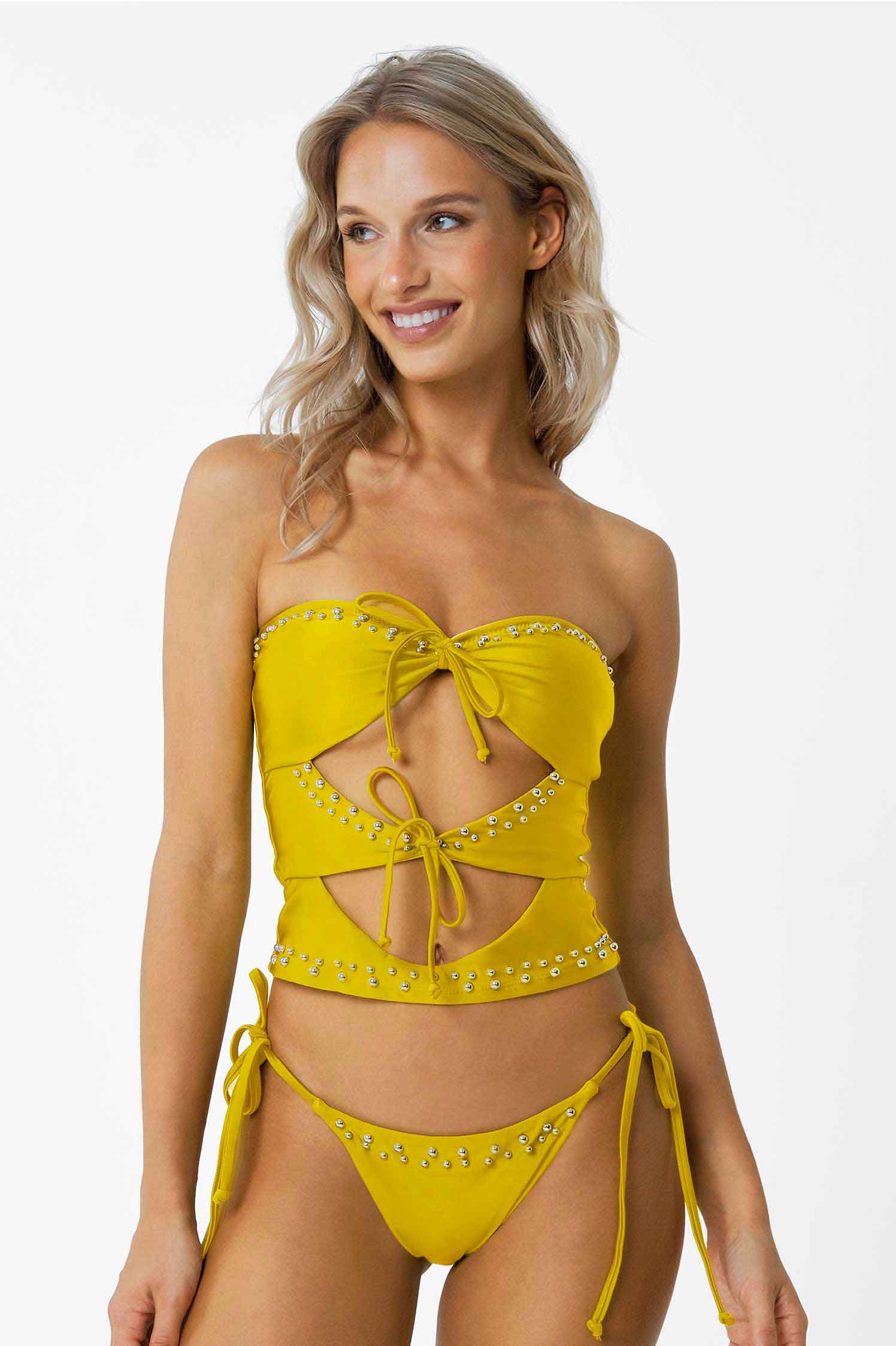 She’s hot, hot, hot! The Emery tankini puts a fierce new twist on the tankini, designed with bold studs and stunning cut-out details, coming all together with its double front ties. Match it with the Dara bottoms for an extra iconic set. Shop The Honey Collection here.